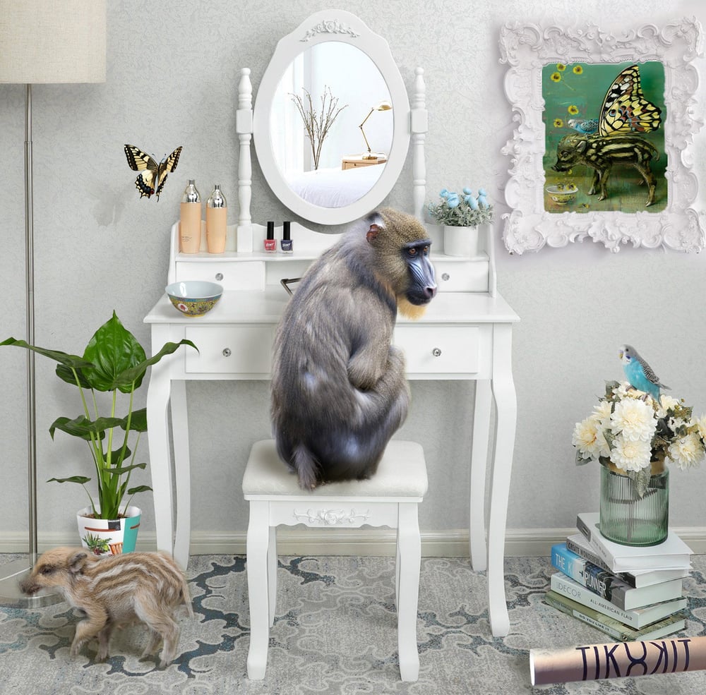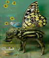 The colors in "Food4Flight" are a celebration of nature's palette, with lush greens, vivid teal, and golden yellows converging to create a visually stunning composition. The juxtaposition of the earthy wild boar with the whimsical butterfly wings adds a touch of surrealism, inviting contemplation on the boundaries between reality and fantasy.